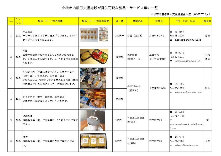 小松市内の就労支援事業所の製品や作業一覧です。落ち合わせについては、事業所の担当者へお問い合わせください。